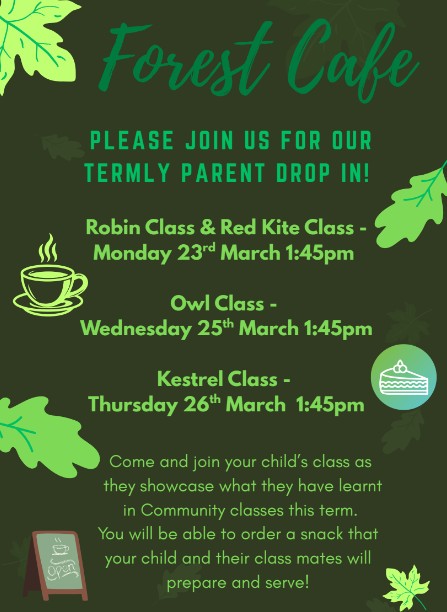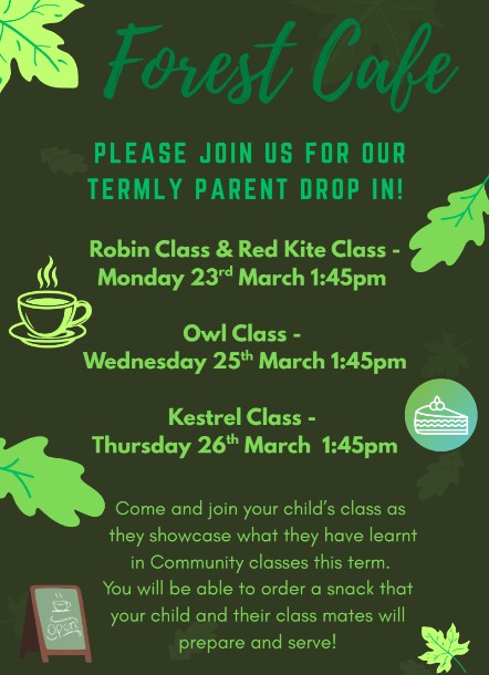Thursday 26th Mar 2600:00 to 23:00Forest Cafe - Kestrel Class - Thursday 26th March 2026 Read more